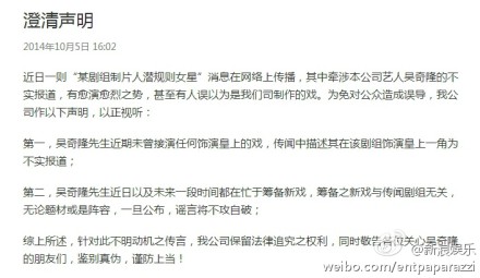 港媒报道称艺人刘至翰在脸书斥责剧组人员和女星进行桃色交易,疑可用陪睡换角色,聊天记录截图中还显示该工作人员称该剧的男主角是吴奇隆、黄宗泽。下午,吴奇隆公司